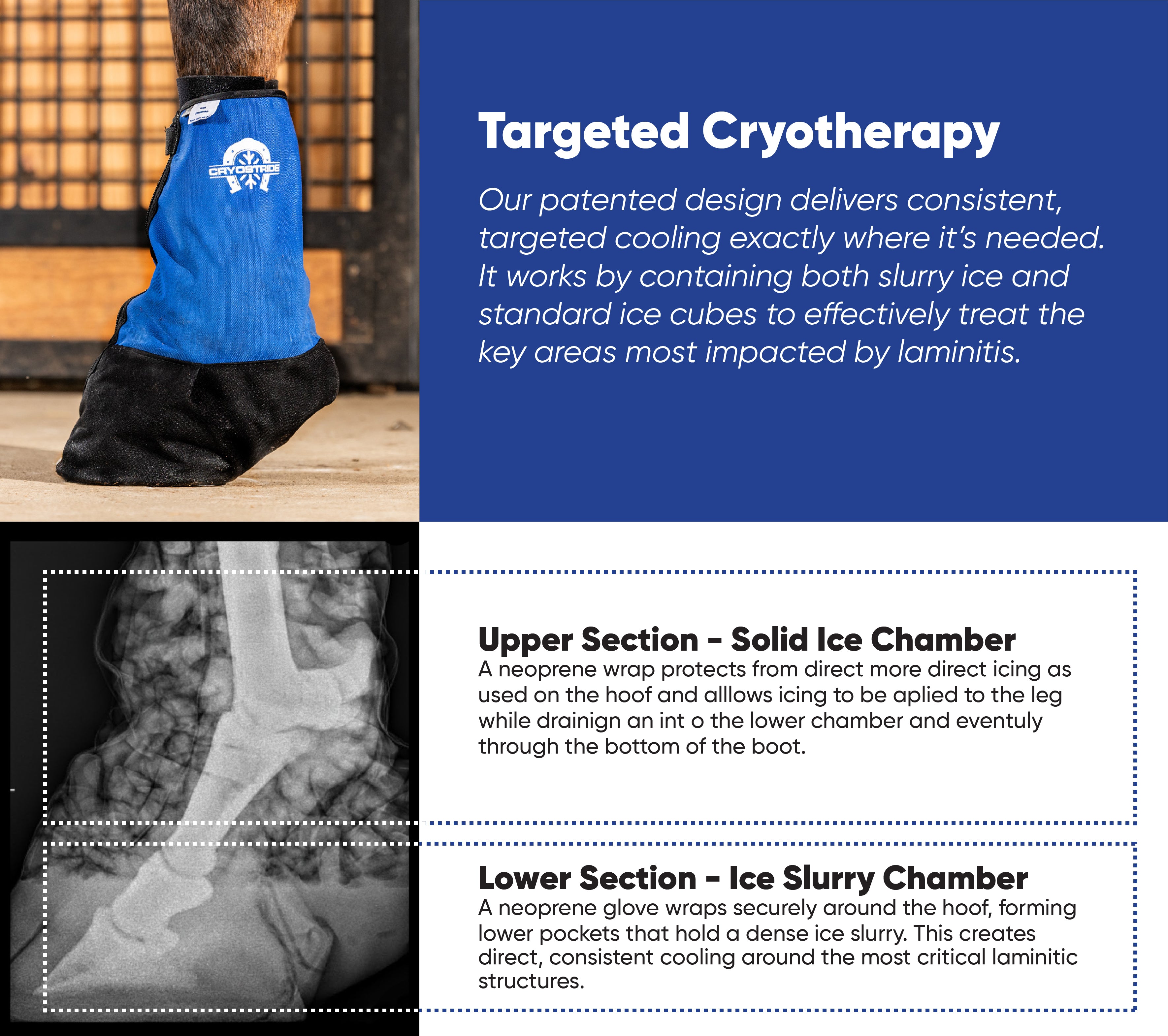 Developed to treat and manage laminitis, a condition where every second matters. Laminitis is a race against time, and each minute of heat and inflammation can cause lasting damage to the hoof. CryoStride™ delivers immediate, targeted cooling therapy designed to reduce internal temperature and slow tissue breakdown before it becomes irreversible.