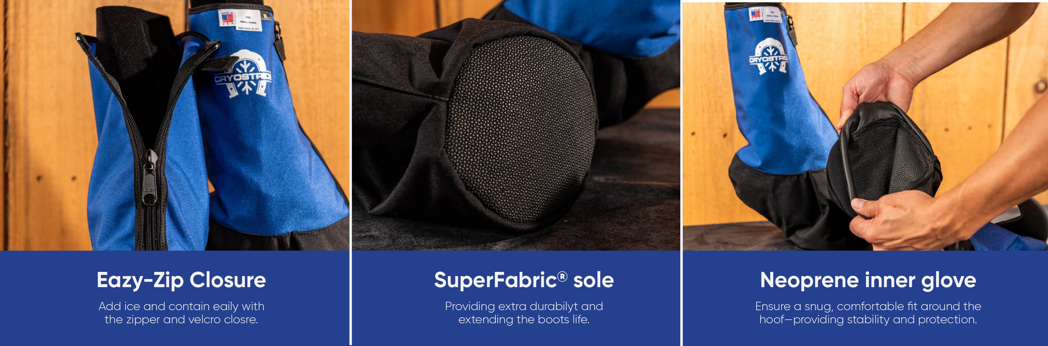 Unlike ice baths or makeshift wraps, CryoStride™ provides consistent, controlled relief that can be applied within seconds of onset. The boots are sold in pairs but can be used on a single hoof or on multiple feet as needed.