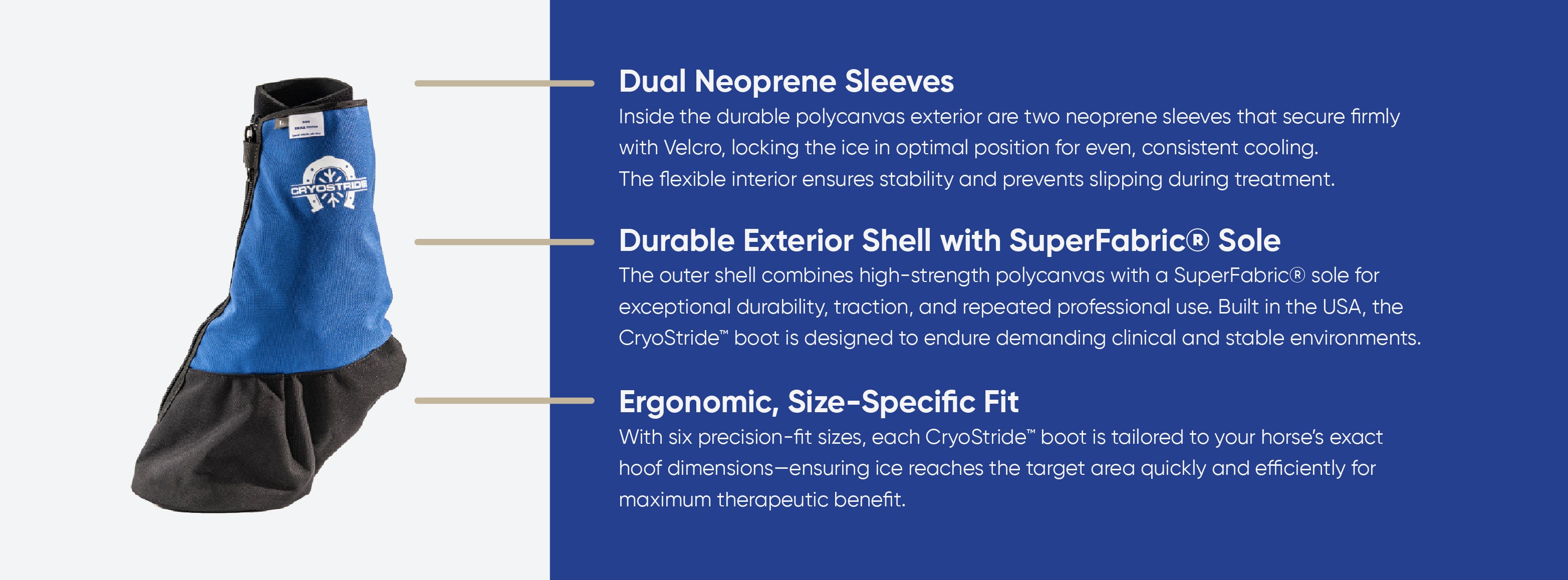 The patented CryoStride™ design targets the critical areas involved in laminitis healing, delivering focused cooling and consistent support where it matters most. Built to aid recovery and rehabilitation, CryoStride™ is an essential tool in modern equine care—from early treatment to full recovery.